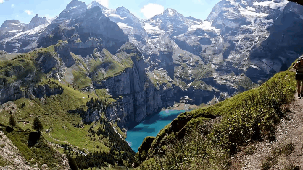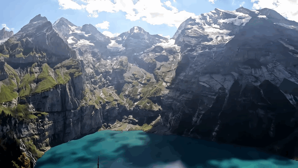 La première vision du lac est souvent un choc esthétique. La couleur de l’eau varie du bleu profond au turquoise laiteux, en fonction de la lumière et des sédiments glaciaires en suspension. Le lac agit comme un miroir, reflétant les parois vertigineuses des montagnes qui le dominent. Le contraste entre le bleu de l’eau, le vert des alpages et le blanc des glaciers du massif du Blüemlisalp est tout simplement saisissant. Plusieurs points de vue, accessibles via des sentiers de randonnée, permettent d’admirer ce paysage sous différents angles, chacun offrant une perspective unique et mémorable.