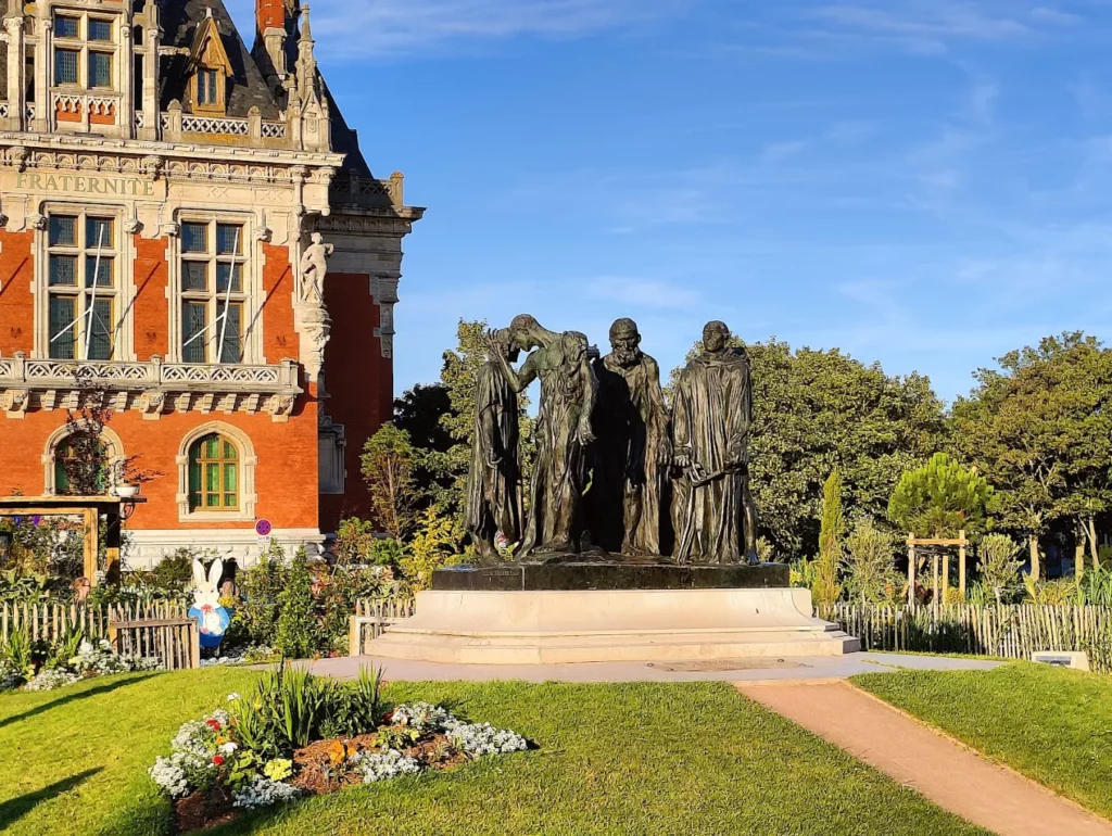 Face à l’hôtel de ville se dresse l’un des plus célèbres groupes sculptés au monde : Les Bourgeois de Calais. Commandée pour commémorer un épisode héroïque de la guerre de Cent Ans, cette œuvre d’Auguste Rodin frappe par son réalisme et sa puissance émotionnelle. L’artiste a choisi de représenter non pas des héros triomphants, mais des hommes en proie au doute et au sacrifice, rendant leur geste d’autant plus poignant. Chaque visage, chaque posture raconte une histoire de courage et de résignation, une véritable leçon d’humanité figée dans le bronze.