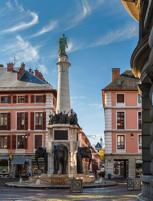 Cette fontaine monumentale a été construite en hommage au général-comte de Boigne, un grand bienfaiteur de la ville qui fit fortune aux Indes. L’architecte, s’inspirant des exploits du général, a conçu une œuvre pour le moins originale. Elle se compose d’une haute colonne surmontée de la statue du comte, reposant sur une base massive en forme de croix de Savoie. Aux quatre coins, quatre éléphants sculptés en fonte, grandeur nature, semblent émerger du monument. Seul l’avant-train de chaque pachyderme est visible, d’où leur fameux surnom. L’eau jaillit de leur trompe pour se déverser dans un bassin. C’est un hommage exotique et audacieux qui symbolise la reconnaissance de toute une ville envers son mécène.